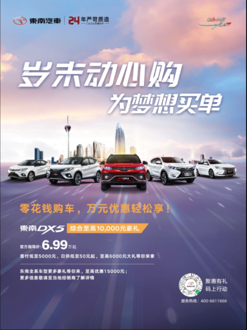 贯穿整月的“双十一”超级福利,不用呼朋引伴“盖楼”助力,轻松享受前所未有的购车实惠,加之东南汽车卓越的产品实力,无论是“明星”DX5,还是极致DX7,高性价比DX3,或至优家轿东南A5翼舞,在此次诚意满满的购车政策下,对于目光敏锐的消费者来说,这无疑是换车、购车的绝佳出手时机,你还等什么?