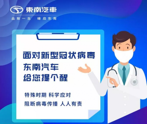 一封家书 给您安心春节假期,新型冠状病毒感染的肺炎疫情牵动着亿人心。疫情防控成为当前最重要的工作。“生命重于泰山,疫情就是命令,防控就是责任”。在这场突如其来的重大疫情面前,东南汽车将和每一位车主积极响应党和国家号召,同心协力,众志成城,为打赢疫情防控阻击战贡献着力量。抗击疫情我们在行动为积极响应国家关于新型冠状病毒肺炎疫情防控工作,同时保障您的车辆保养权益,如在2020年2月底之前因疫情影响无法及时至东南汽车指定的服务网点进行保养,东南汽车服务网点可自动为您延后1个月,如有特殊情况您也可主动联系服务网点预约登记延后保养(3个月内),在此期间车辆享受的质保政策不受影响。同时请每位车主在出车前务必做好车辆清洁卫生、消毒等工作。平时车内尽量多通风,坚持戴好口罩。