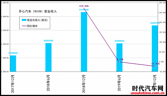 2019年,开心汽车的总净营收为3.35亿美元,同比下降22.42%。而2018年,总净营收为4.31亿美元,同比增长270.03%。